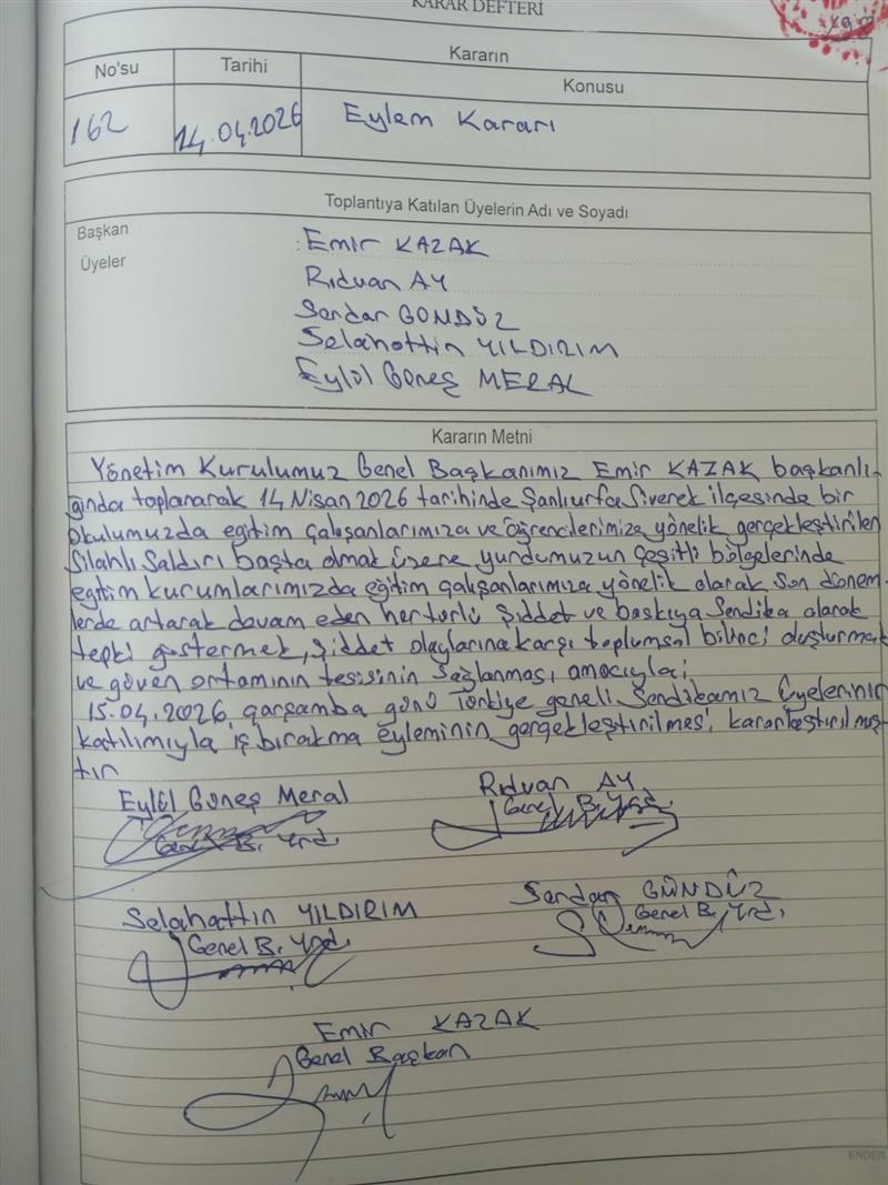 Liyakat- Sen Genel Merkez Yönetim Kurulu tarafından alınan 14.04.2026 tarih ve 162 sayılı karar doğrultusunda, 15.04.2026 tarihinde 1 günlük iş bırakma eylem kararını üyelerimizin ve kamuoyunun bilgisine sunarız.