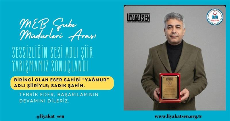 Liyakatli Eğitim ve Bilim Çalışanları Sendikası tarafından düzenlenen MEB Şube Müdürleri arası “Sessizliğin Sesi” adlı şiir yarışmasında birincilik ödülünü kazanan Bayburt İl Milli Eğitim Müdürlüğü Şube Müdürü Sayın Sadık Şahin’i gönülden tebrik ediyoruz.