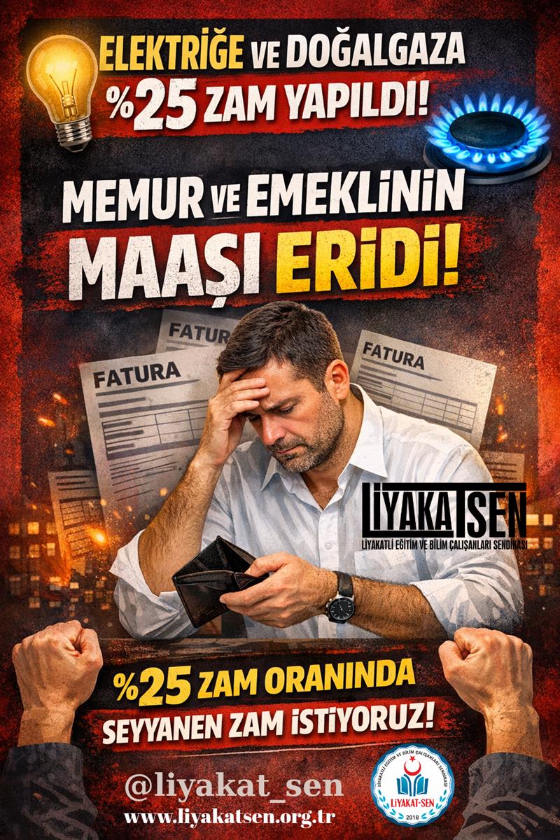 Elektriğe ve doğal gaza %25 zam yapıldı. Memur ve memur emeklisinin maaşları eridi. Elektriğe ve doğal gaza yapılan %25 zam oranında seyyanen zam talep ediyoruz.