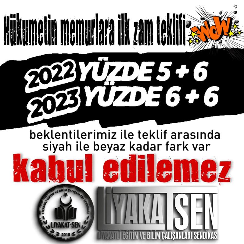 Liyakatli Eğitim ve Bilim Çalışanları Sendikası Genel Başkanı Kazak'dan maaş zamları ile ilgili değerlendirmede bulundu. Kazak sözlerine şöyle devam etti; 6,5 milyon memur ve memur emeklisi için hükümetin 2022 için %6, 2.altı ay için %5, 2023 için %6+6 ve enflasyon farkı önerisi kabul edilemez, müzakere edilemez ve onur kırıcıdır. 6,5 milyonu temsilen masada oturanlar ekonomik gerçeklerden uzak bu teklifi müzakere edilebilir görmesi, ciddi tepki göstermemesi daha önce vizyona girmiş bir filmin fragmanını izlemekten öte gitmeyecektir. 3600 ek gösterge tüm kamu çalışanlarına adaletli bir şekilde verilmelidir. Herşeyden önemlisi hiyerarşik ücret adaletinin sağlanması öncelikli olmalıdır. Memurlar için bu zamana kadar verilen zamların üzerinde çıkan enflasyon farklarına rağmen.