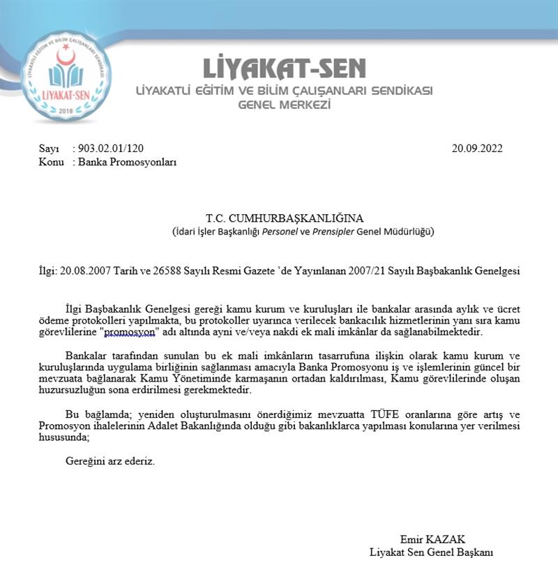 Liyakat Sen Genel Merkezi olarak, Banka Promosyonları konusunda Cumhurbaşkanlığına başvuru yaptık. İşte resmi yazı;