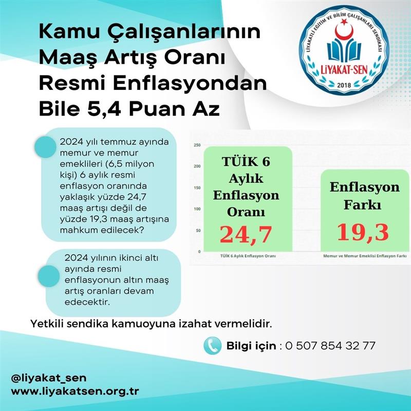 Bu yetmezmiş gibi TÜİK tarafından 2024 yılı haziran ayı enflasyon verilerinin açıklanmasıyla ilk altı aylık kümülatif enflasyon oranı 24,7 olarak açıklanmıştır. Hissedilen enflasyon bu rakamın çok çok üzerinde olmasına rağmen memur ve memur emeklilerine TÜİK oranlarında maaş artışı bile (enflasyon farkı zam değildir.) çok görülmekte, memur ve memur emeklileri resmi altı aylık enflasyon oranının 5,4 puan altında maaş artışına mahkum edilmektedir.