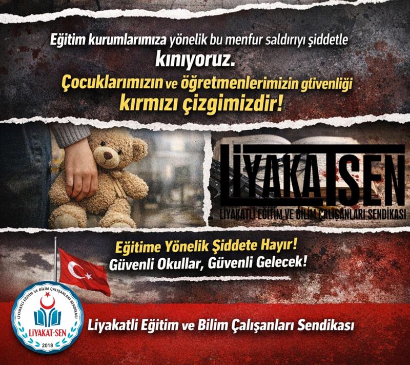 Liyakatli Eğitim ve Bilim Çalışanları Sendikası olarak, saldırıda zarar gören tüm öğrenci ve eğitim emekçilerine geçmiş olsun dileklerimizi iletiyor, bir daha böyle acıların yaşanmaması için mücadelemizi kararlılıkla sürdüreceğimizi kamuoyuna saygıyla duyuruyoruz.