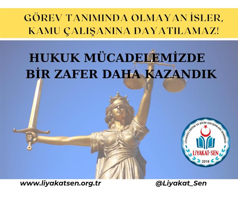 Bingöl İli Solhan İlçe Millî Eğitim Müdürlüğünde şef olarak görev yapan bir üyemize, şefin görev tanımında olmayan işleri yapmadığı gerekçesiyle açılan soruşturma neticesinde verilen uyarı cezasını, İdare mahkesine götürerek cezanın iptalini sağladık. Ayrıca aynı ilçe millî eğitim müdürlüğü daha önce personel görevlendirme yazısında şef'e memur görevlerini tebliğ etmiş liyakat Sen olarak bizlerde kanun ve yönetmeliklere aykırı olduğu gerekçesiyle bu görev tebliğini mahkeme konusu etmiş ve iptalini sağamıştık. Kamu yöneticileri uyuşmazlık konusu olan ve mahkemeye intikal eden davalarda mahkemelerin gerekçeli kararlarını idrak etmesi elzem arz etmektedir. Ak takdirde söz konusu olan yöneticilerle ilgili görev yetkisini kötüye kullanma ve keyfi olarak kamu zararı oluşturma dahil her türlü hukukî takip değerlendirilecektir.